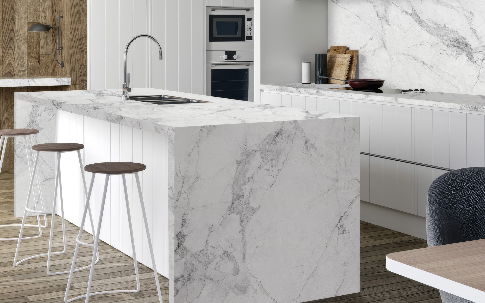 Maksimali švara ir atviros erdvės efektas įkūnytas Calacatta Riviera dekore. Beveik baltas paviršius su vos pastebimomis pilkomis gyslomis sukuria begalinės erdvės iliuziją ir užpildo patalpą šviesa.